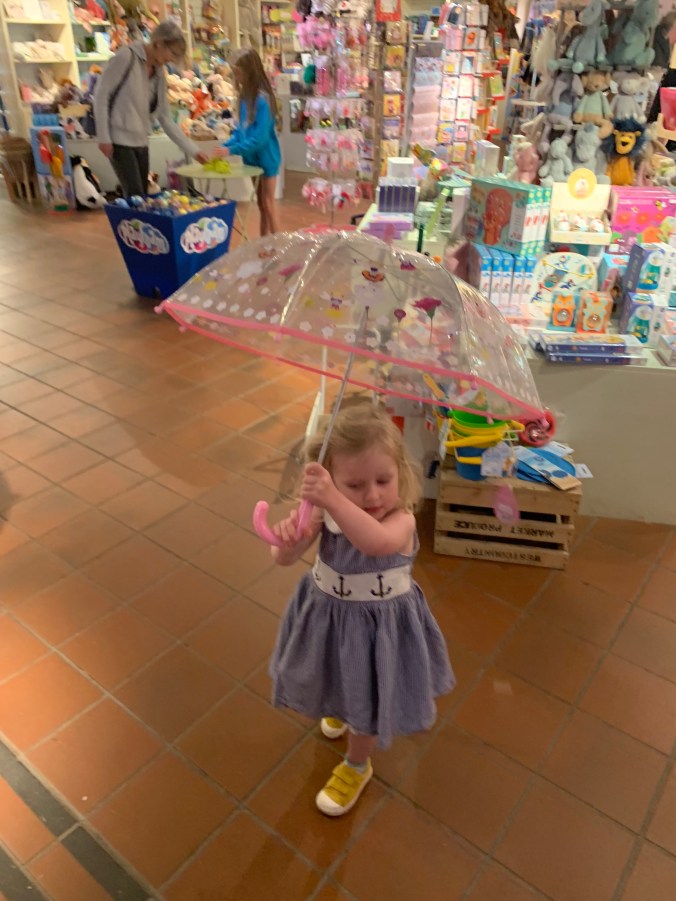 We did save the last 5 minutes of our slightly tarnished trip out when we headed for the toy shop there and asked Polly to pick a little birthday present. She picked an umbrella.