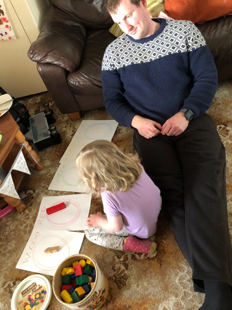 13:55- Seb wakes up. Polly asks to play a game, this is one from the 5 minute mum book that has proved a fab lockdown purchase, literally sorting the colours out!