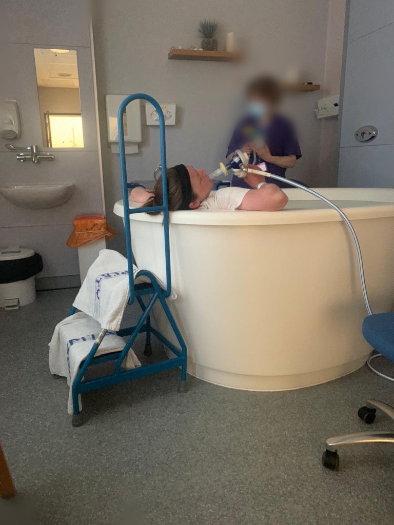 Once inside Henry had to stay in the waiting room while the midwife checked whether I was the magical 4cm and therefore in active labour which would allow Henry entry into the birthing chamber- thankfully I was 5 (never thought I’d brag about how dilated my vagina was!). Next came the dreaded COVID test- I didn’t realise till afterwards that they poke that swab 7cm up each nostril! This was great fun in between contractions and after feeling like my brain had been poked I actually declared the midwife poking downstairs was more bearable!