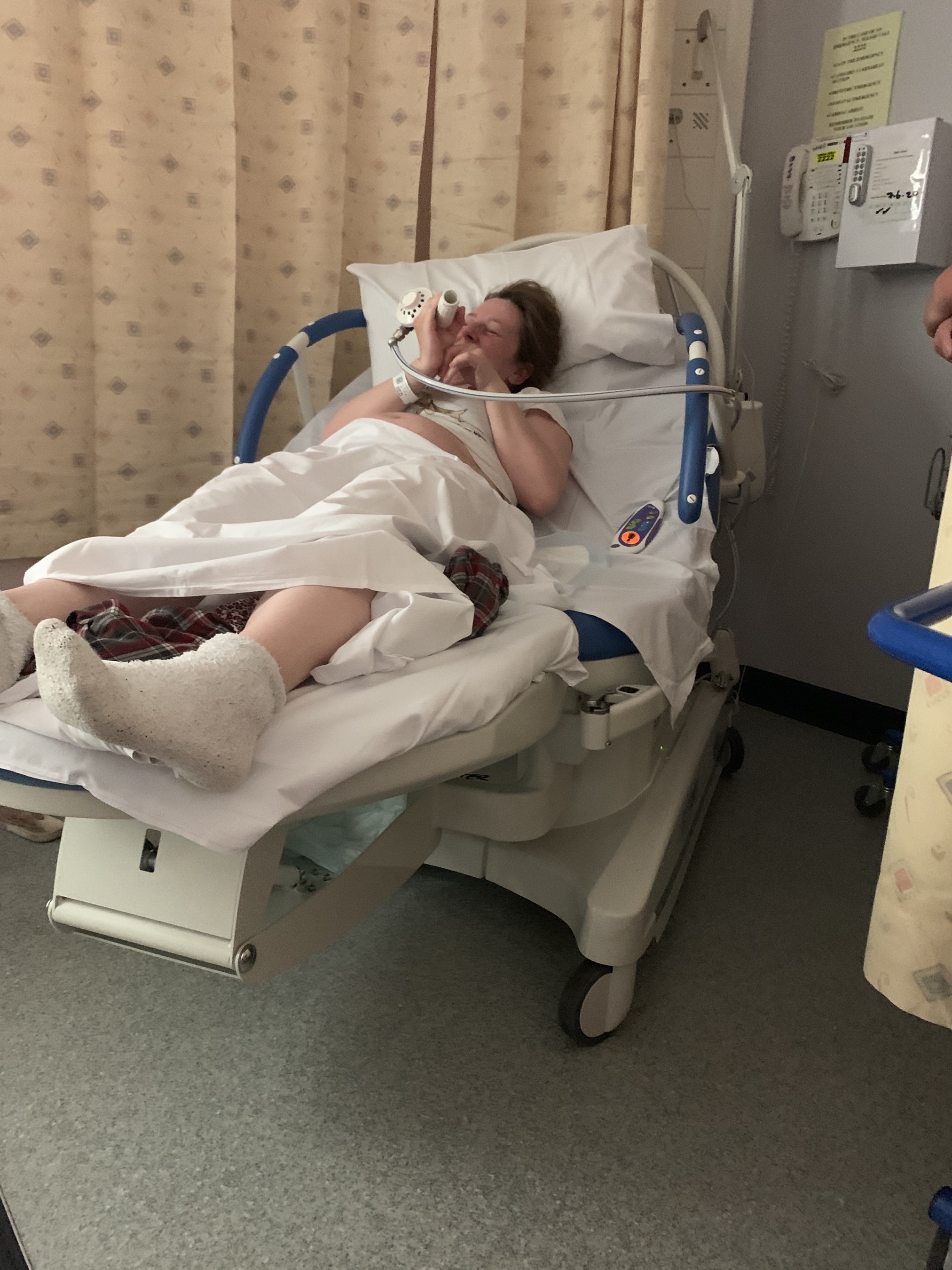 After being examined the doctor determined this was definitely something that needed to come out, so thankfully not a prolapse. They briefly explained that they would need to extract whatever ‘retained products’ were still in there. I asked if it would hurt and they offered me gas & air which from experience if they are offering it then take it as it the next few moments are probably going to be uncomfortable. I sucked on that gas like my life depended on it and went into a bit of haze, coming out of the haze to the sound of laughter- apparently I was a bit reluctant to give it up as the lovely picture Henry took shows!