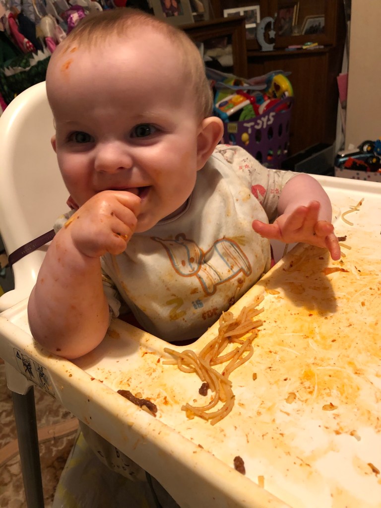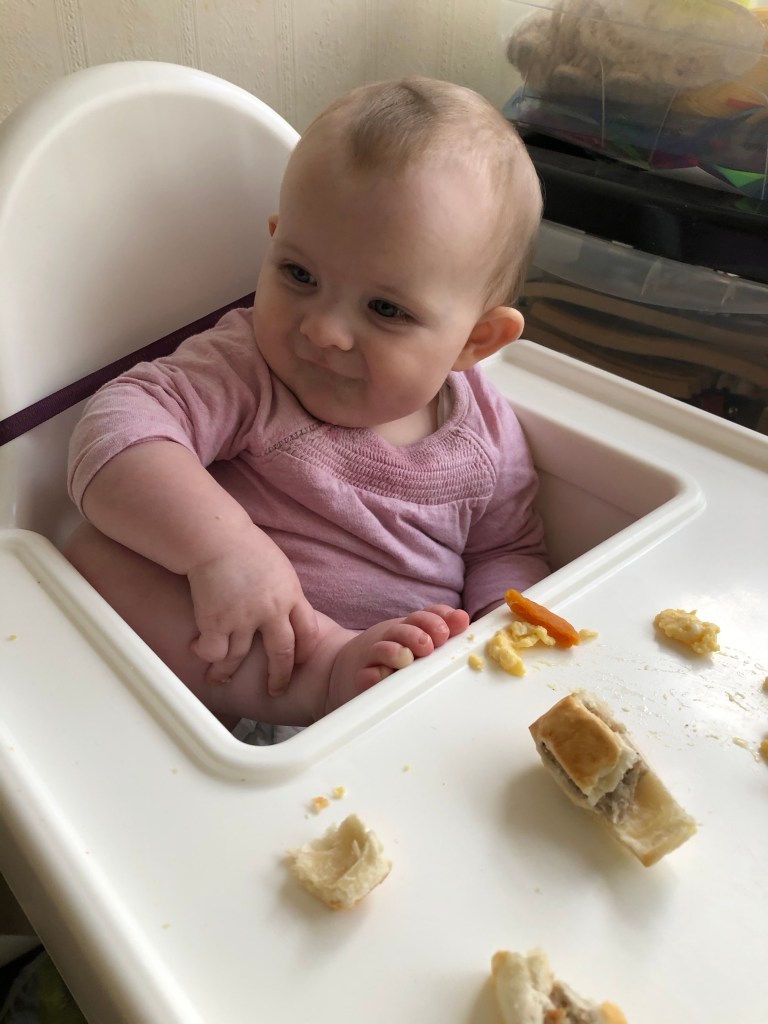 Clara bear has now officially reached the “I can’t crawl but I want to so I’m gonna scream at things I want to reach but can’t” stage- it’s a highlight they don’t mention in the parenting books. She has no trouble reaching her food though and will shove anything in!