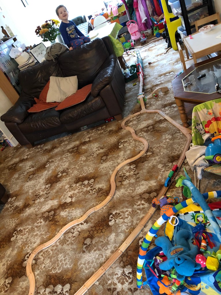 It seems Seb has come through some sort of developmental leap over the last week or so after a couple of weeks of disturbed sleep and grumpy behaviour he’s emerged with a few new skills under his belt. The best one is a new understanding of humour which means he’s doing cheeky little things like throwing a cushion onto daddy’s face as he lay on the floor daydreaming and cracking up at funny things he sees. He’s also finally (thank god!) figured out how the brio train track fits together so instead of shouting at pieces of track and throwing unsuspecting trains across the room when they uncouple, he is instead secretly building tacks that quickly span across the whole room and has worked out how the trains fix together only if the magnets are in the right order. It’s bought a new sense of calm to the house and a new trip hazard!