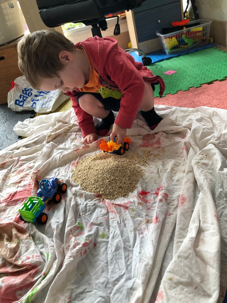 11:13- Do a shoddy job of clearing up the oats so the hoover comes out again! Seb ‘helps’ with the toy one.