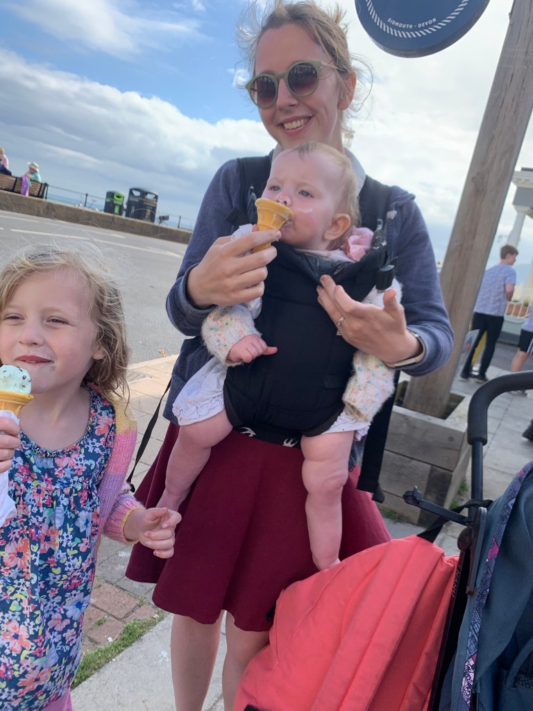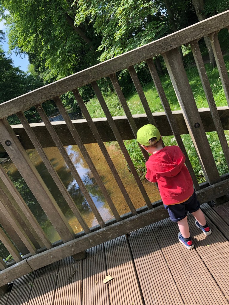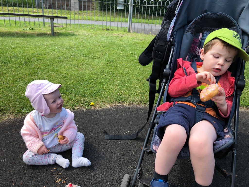 11:22- Sun tan lotion on, hats on and off to Lidl we go. We walk through the byes, play Pooh sticks, watch the bees at work, Seb blows a dandelion in Clara’s face which she finds hilarious. Seb picks out a pink donut and is a bad influence on me too, we head to the park to eat our treats and have a play.