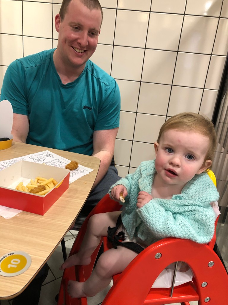 After saying goodbye to the family we headed back home, of course we hadn’t eaten tea yet so the kids yet again emotionally blackmailed us into a McDonald’s. Clara then made it a memorable experience by doing a poonami and as she’d already gone through all her spare clothes after going swimming she spent the rest of the meal like this…