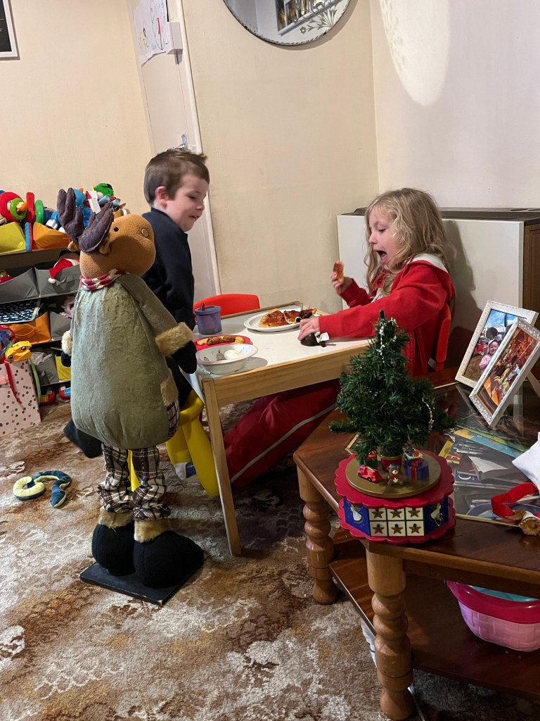 The Christmas bits also include a small reindeer and a giant one (the same height as Clara, who incidentally has been mistaken for a child out the corner of both our eyes many times!), both these reindeers were invited to tea with the children this week with the big two sharing all their food with each of their new ‘pets.’