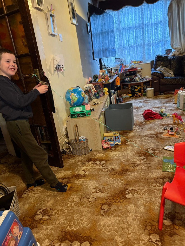 10:24- Seb starts getting a bit restless so I set up a little zip line for him with a Lego man inside.